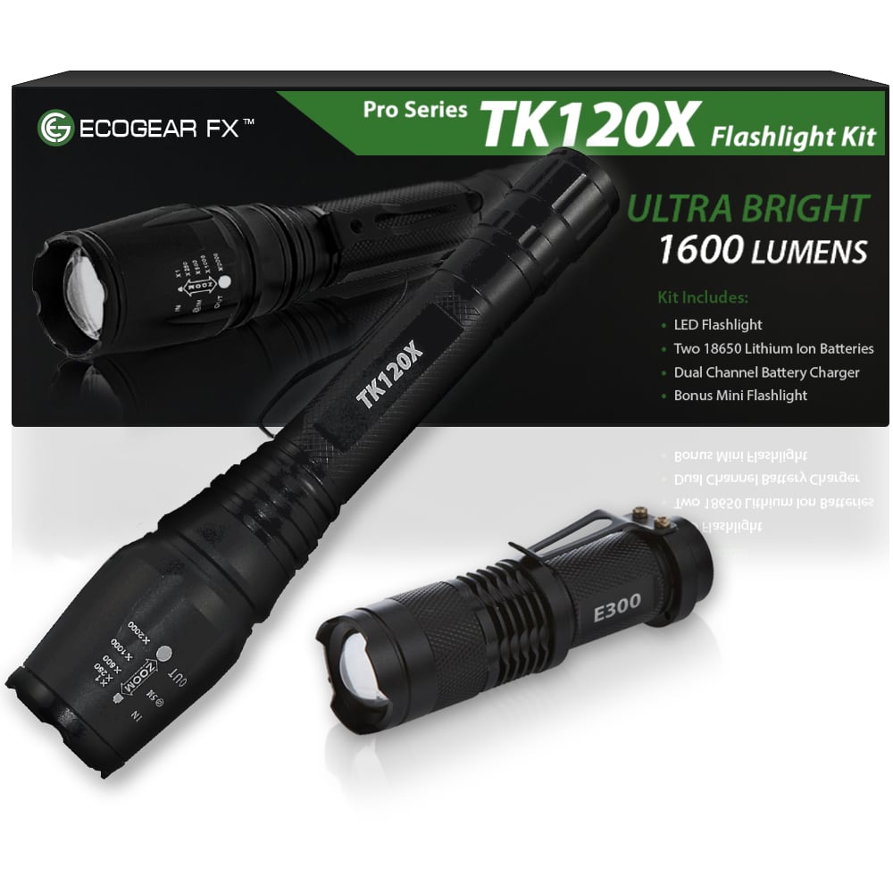1 x TK120X LED Tactical Flashlight with Holster 1 x Attached Lanyard (removable) 1 x Attached Belt Clip (removable) 1 x Rapid Battery Charger 2 x Rechargeable Batteries 1 x Storage Case for Batteries 1 x Mini E300 LED Flashlight (battery not included) 1 x User Manual   The TK120X Tactical Flashlight with holster is a great choice for hunters, disaster workers, security guards or anyone who needs to see better at night. It’s rugged, durable and ready to go anytime.