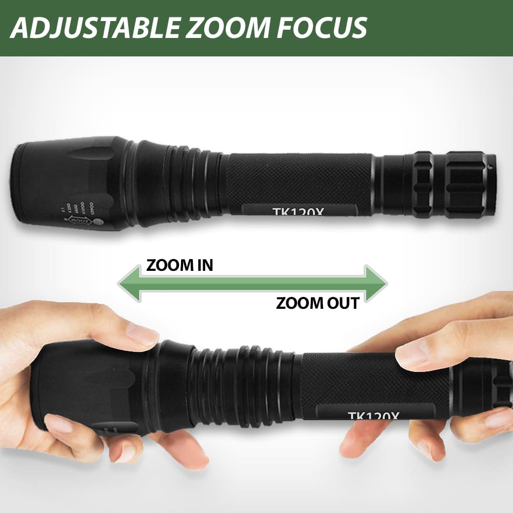 One of the important features of this LED flashlight is the zoom lens. It’s ideal for many situations from hunting and camping to security work. The Adjustable Focus Zoom on the TK120X LED Tactical Flashlight allows you to shine the light beam on a targeted area. It can even be something in the distance. You might need enhanced light on a moonless night to spot a deer or an owl in a tree. Security guards often need to see exactly what something is even in a dark warehouse. It might be a stray animal but it could be a thief. You need to know. 5 Light Modes Five Preset Light Mode OptionsThe TK120X Flashlight offers five different preset light modes (High, Medium, Low, Strobe and SOS). Want to change to a different light mode? It’s easy. Just quickly click on the tail-cap button. This is a must-have for those who like to go jogging in the evenings. This professional LED flashlight can be a lifesaver for individual self-defense. Of course, if you just need a simple flashlight on any project, use the medium or low beams. In S.O.S. mode, the flashlight will send out the international Morse code distress signal. When activated, the light beam flashes quickly three times, slowly three times, followed by three more fast flashes. The light flashing frequency is standard and the S.O.S light mode repeats itself when the light cycle completes.